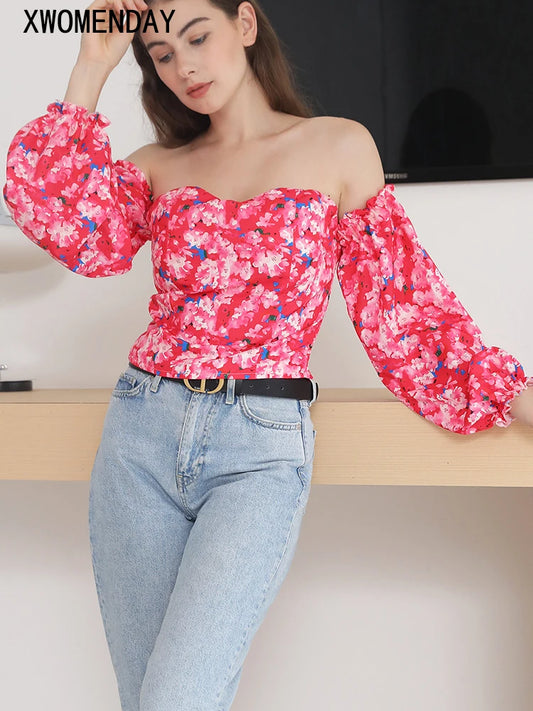 Elegant Floral Blouses For Women Sexy Backless Off Shoulder Crop Top Youth White Blouse Fashion Summer Women Clothing 2024