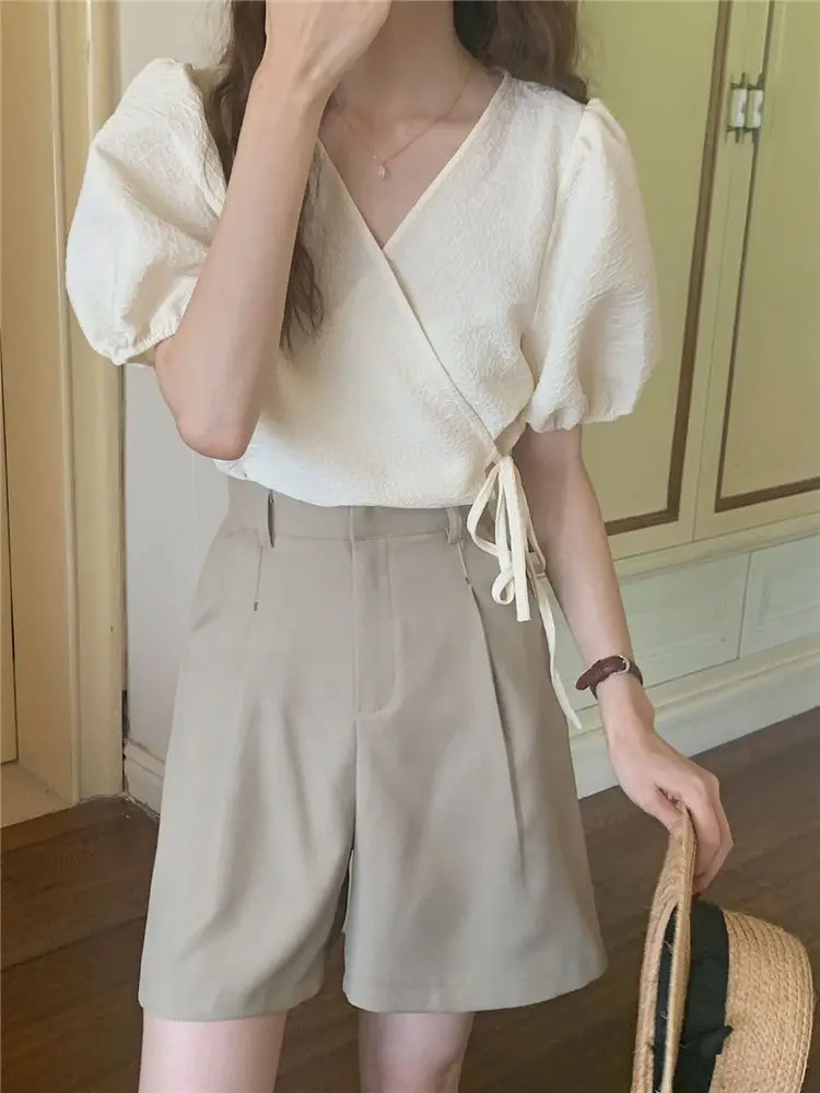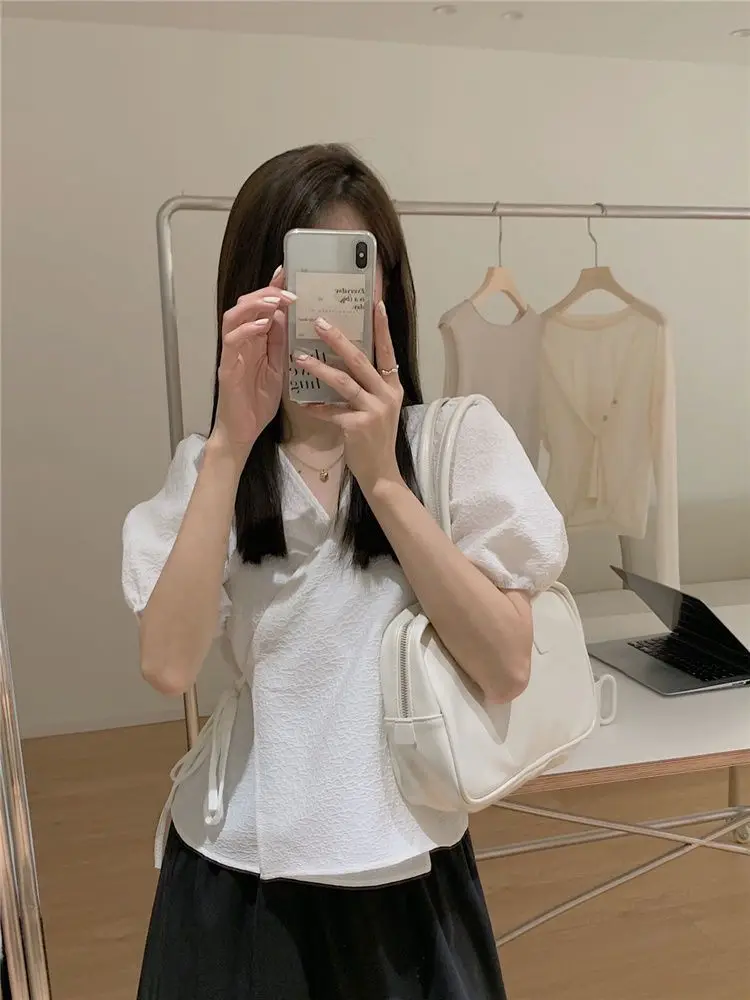 Blouses Women Summer Korean Style V-neck Design Simple Puff Sleeve Leisure Lace-up All-match Vintage Elegant Daily Trendy Tops