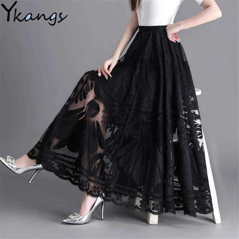 Elegant High Waist Lace Skirt Women'S New A-Word Black Long Skirt Office Ladies Big Swing Gauze Hollow Pleated Skirt Streetwear